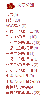 公告、日記、ACG雜談沒有變動,其他分類多出了「集」和「單篇」,遊戲類的還有「分類」。