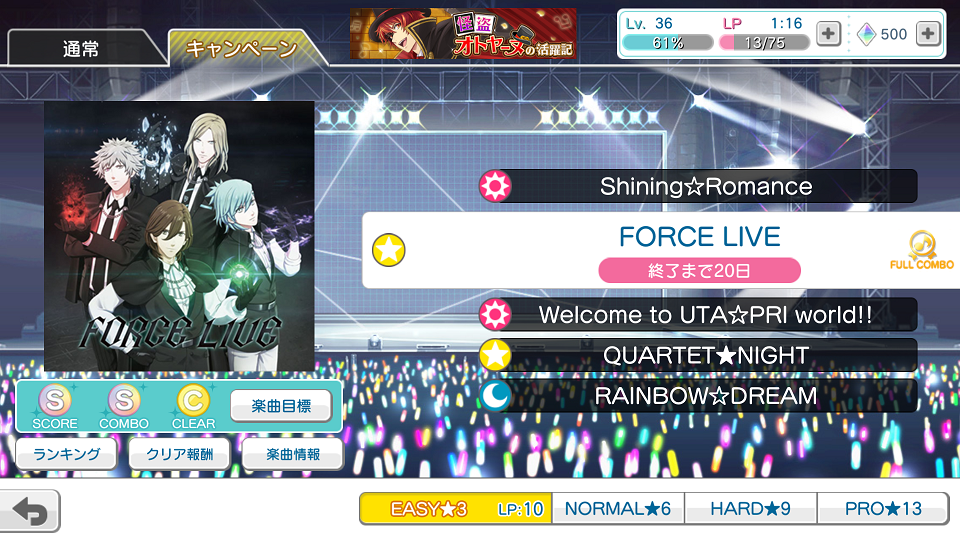 遊戲裡的Live就是節奏遊戲,如畫面右下顯示,一共分成四個等級,需要花費的LP也會逐漸增加。