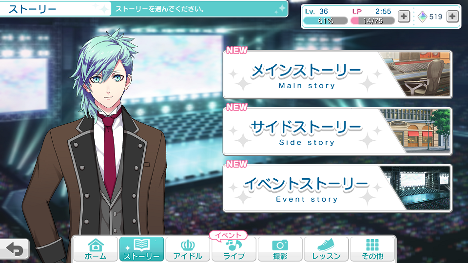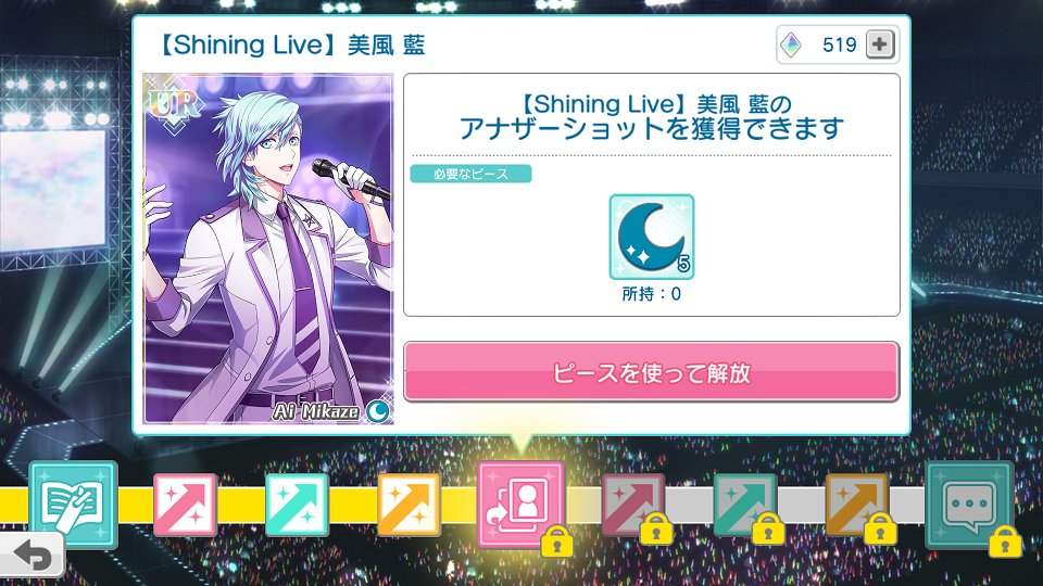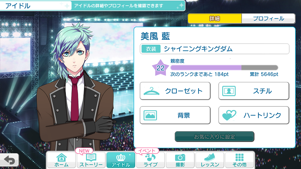 偶像詳細畫面,解鎖卡片服裝後可以換衣服;看過支線劇情後可以獲得CG;看過其他劇情有機會獲得背景。