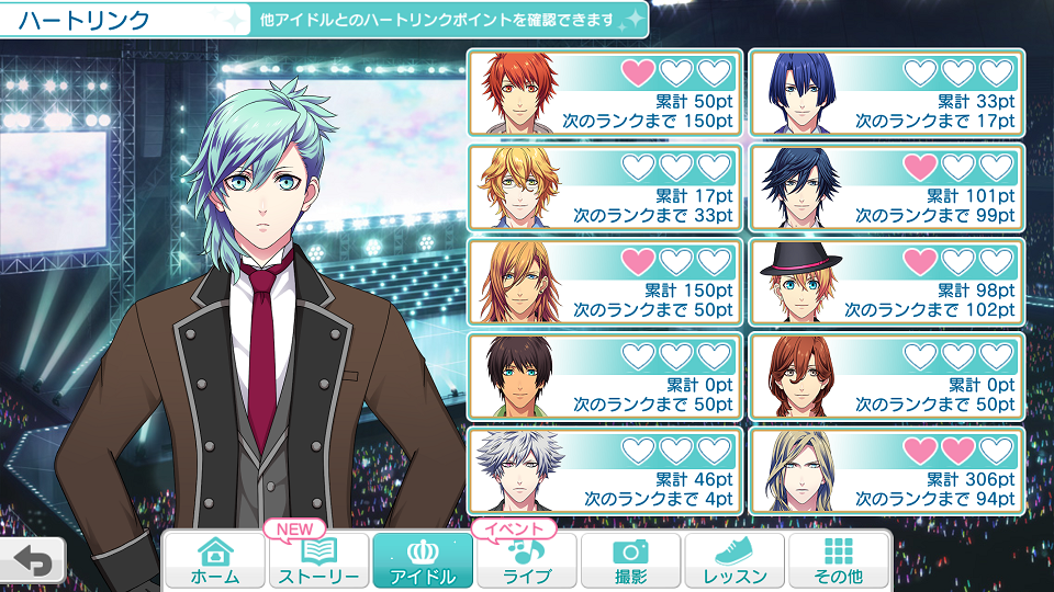 把不同角色編組去打節奏遊戲,就會增加Heart Link的點數,每升一級可以解鎖該角色對其他角色的感想語音。
