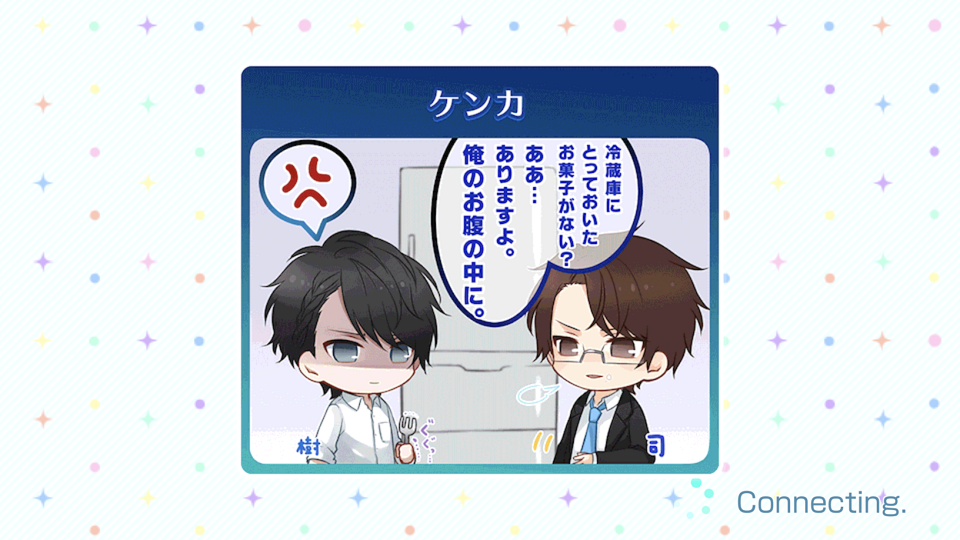 至於「ストーリー」的故事畫面就和一般乙女遊戲沒兩樣,而且在這裡是有選項的,但如果是在關卡那邊看劇情就不會有選項。